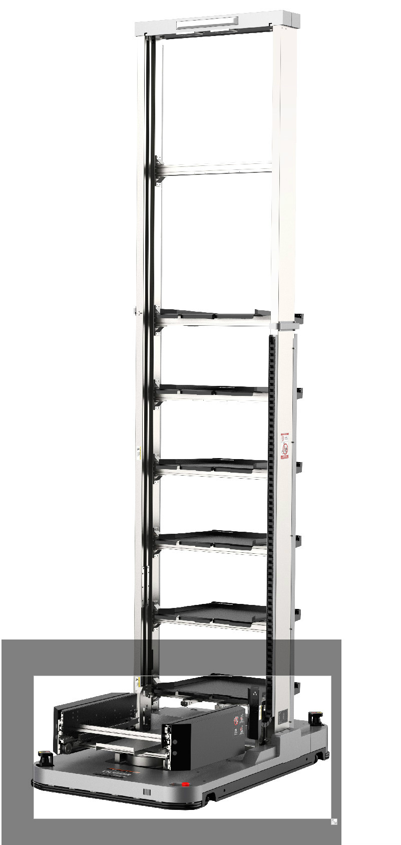 車身低矮,可以進入低矮的料架地下牽引。潛伏牽引并且雙向運行可以使轉彎半徑縮小,占地面積小。 驅動單元一鍵電動升降方便維護。最多可以指定1024個站點。 激光傳感器安全防護到位